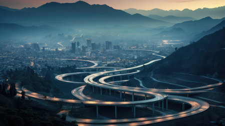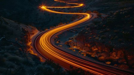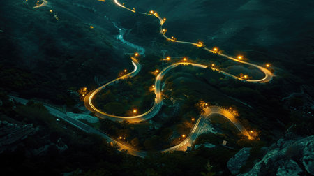 Curvy mountain road with trailing lights at night, Aerial view of mesmerizing nocturnal landscape. Ai Generated