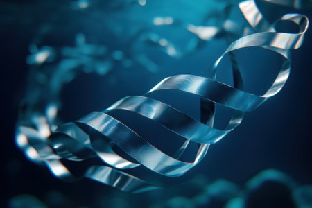 A silver ribbon with a blue background. The ribbon is twisted and curled. The ribbon is made of a shiny material