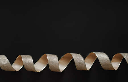 Gold color ribbon curly on black background, copy space. Christmas gifts concept, festive holiday card template