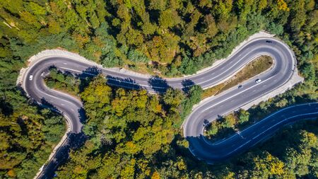 Curved road trough the forest. Pass in Transylvania, Romania. Aerial view from a drone.