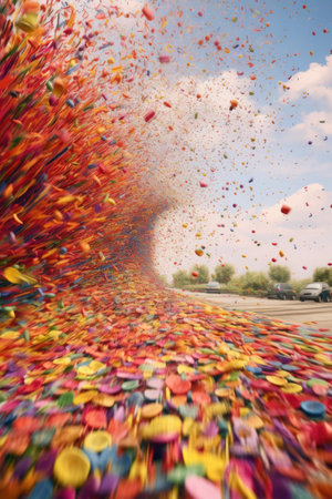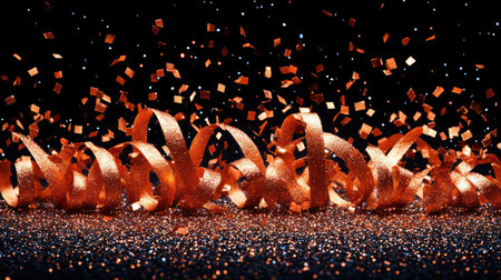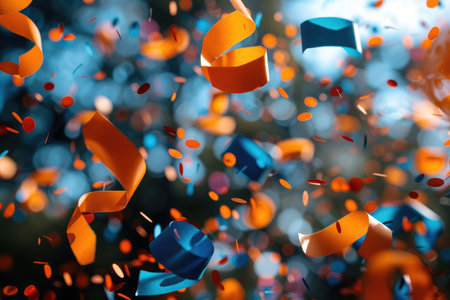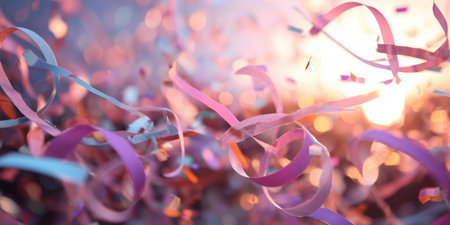 Vibrant showing vibrant cascade of colorful confetti and streamers falling against a bokeh background of warm golden lights celebrating a festive occasion keywords:...