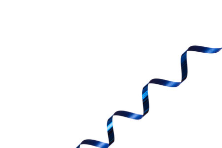 A silver ribbon with a blue background. The ribbon is twisted and curled. The ribbon is made of a shiny material