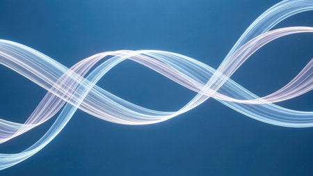 This image presents abstract flowing lines gracefully curving across a vibrant blue backdrop. The lines exhibit a gradient of colors, from white to pale blue. The composition suggests motion and dynamism, likely suitable for designs in technology or creative endeavors. It can be used for various commercial and editorial applications.
