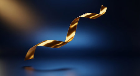 showcases a single, lustrous golden ribbon suspended and gracefully twisting in a dark, atmospheric studio setting. The ribbon's metallic surface reflects subtle highlights and shadows, emphasizing its smooth, fluid form. The deep blue background creates a stark contrast, making the golden ribbon the sole focal point. The lighting is dramatic, casting soft reflections on the surface below, enhancing the sense of luxury and sophistication.