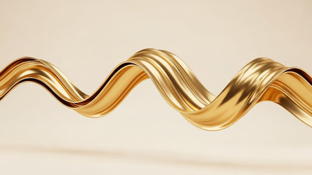 A highly polished golden ribbon twists and turns in a dynamic, fluid wave against a soft, neutral background. The metallic exhibits a sheen, with deep shadows and bright highlights that accentuate its sculpted form. The ribbon's movement suggests energy and elegance, creating an abstract and visual.