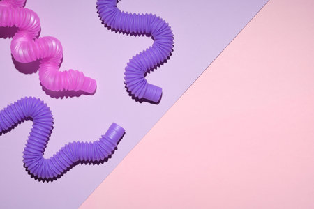 Multi-colored corrugated plastic pipes on a bright background. Popular poptube game on a lilac background