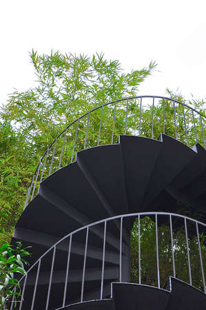 Upward perspective view of a spiral staircase, made of cast iron. Against a backdrop of tall bamboo plants.