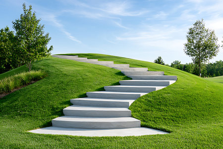 A beautiful scene showcasing curved concrete steps gracefully ascending a lush green hill beneath a bright blue sky, inviting tranquility and relaxation.