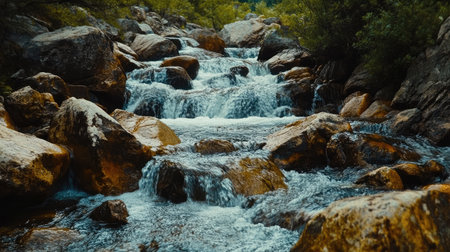 AI Generated. Crossing tranquil waters rocky river pathways serene stream nature exploration lush greenery ground level adventure and relaxation
