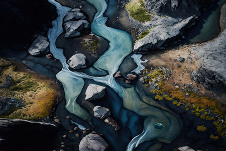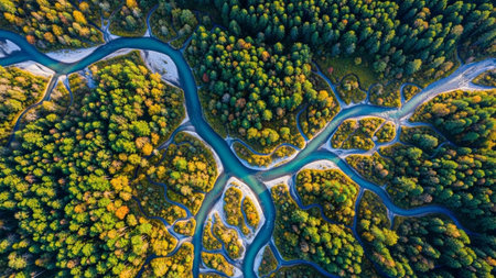 An aerial perspective reveals a network of winding rivers and streams carving through a dense forest. The trees display a vibrant palette of greens and yellows, suggesting the beauty of autumn foliage. The intricate patterns formed by the watercourses and the forest canopy create a visually natural tapestry. This overhead view showcases the organic beauty and intricate textures of the wilderness, highlighting the serene and tranquil flow of water through the lush woodland.