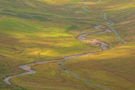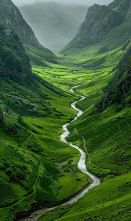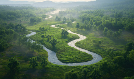 Serpentine river meandering through lush green valley, misty morning; nature background for travel brochures