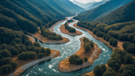 Aerial view of a winding river flowing through a picturesque valley, surrounded by mountains and lush vegetation. Ai generated image