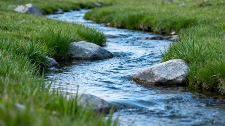 A stream gracefully cuts through a breathtaking hillside covered in lush green vegetation, A lush valley filled with wildflowers and a bubbling brook, AI Generated