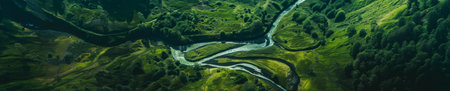 Vibrant aerial view of a lush valley with a winding river under soft light