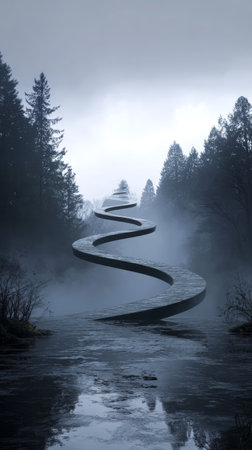 Misty forest winding path surreal elevated walkway tranquil mysterious nature foggy landscape serene