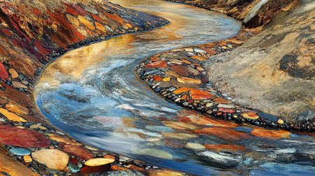 A stunning depiction of a winding river surrounded by vibrant stones, showcasing the beauty of nature's colors under sunlight. Perfect for nature lovers.