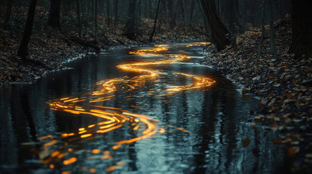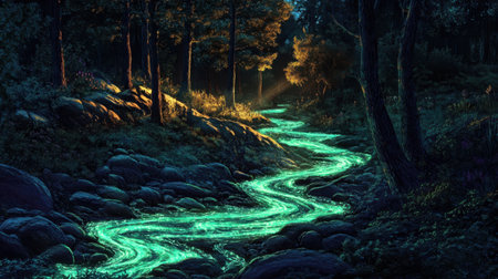 A mystical river glows with vibrant light as it winds through a tranquil forest. The surrounding trees create a serene atmosphere, illuminated by the fading daylight.