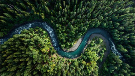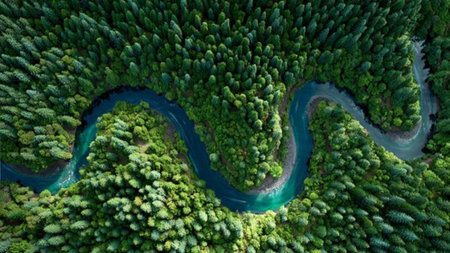 An impressive aerial perspective reveals a winding river snaking its way through a vast, dense forest. The river's dark blue water creates a striking contrast against the vibrant green canopy of the trees. The serpentine path of the river forms an intricate, organic pattern, showcasing the natural beauty and untouched wilderness of the area. The dense foliage of the forest stretches as far as the eye can creating a rich texture and a sense of deep immersion in nature.