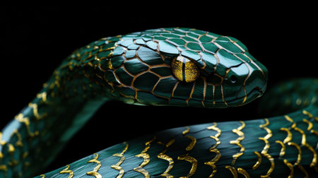 Green snake coiled on a textured black background, showcasing its scales and vibrant color Ideal for nature, wildlife, exotic themes, and reptile enthusiasts looking for striking imagery