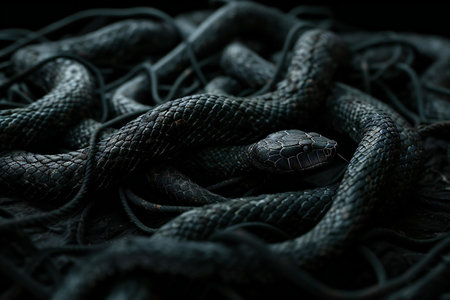 Captivating Dark Viper Gazes Intently, Showcasing Its Intricate Skin Patterns in Enigmatic Lighting
