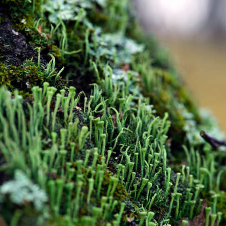 Lichen cladonia coniocraea and moss on tree bark in autumn forest.