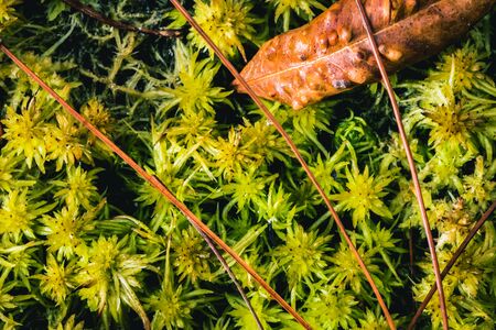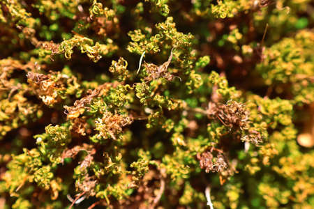 Close-up of small moss plants that are green and in forest nature and with moss in spring and autumn of the smallest plants in macro.
