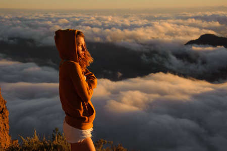 Girl in stylish clothes stands on cliff