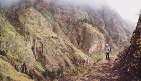 Male hiker on the steep rocky path to famous Paul Valley admiring impressive mountain face. Santo Antao Cape Verde Cabo Verde