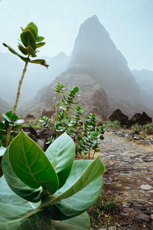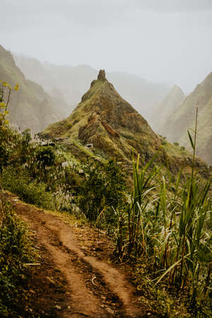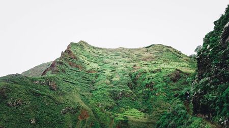 Cape Verde. Stunning scenery with cloudy mist flowing over huge mountain edge and slopes and spilling into the green valley. Santo Antao Cape Verde Cabo Verde