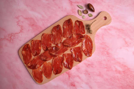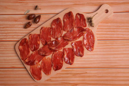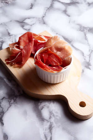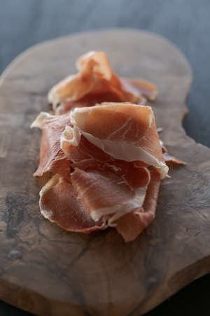 close-up view of A wooden cutting board is topped with delicious spanish serrano ham slices