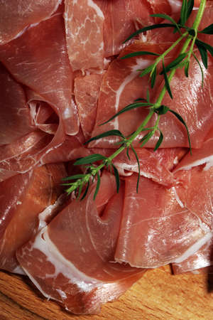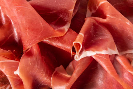 Meat, ham, jamon, or prosciutto sliced for bruschetta. Sliced ham, jamon, or prosciutto as a food background for your design