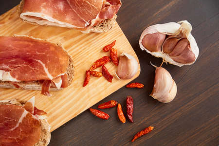tapa of ham toast with tomatoes and olive oil. traditional Spanish and Mediterranean food