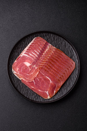 Slices of prosciutto di parma or jamon serrano (iberico) on a black plate on a dark slate, stone or concrete background. Top view with copy space.