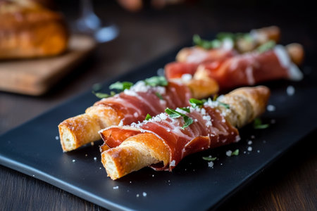 grissini sticks wrapped in jamon on black plate on the table with copy space