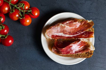 zenital plane ed a plate of ham and tomatoes. traditional Spanish food