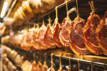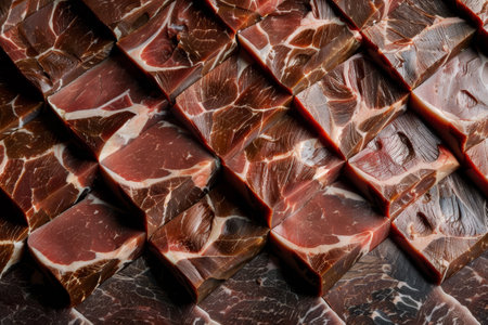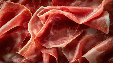 Delicately arranged thin slices of cured meat showcase rich colors and textures, tempting the viewer with their savory appeal. Perfect for a charcuterie board.