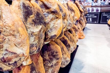 Spanish hamon in barcelona market, jamon iberico in view black leg pork isolated, traditional national spain meat in store, serrano prosciutto food on background gastronomy
