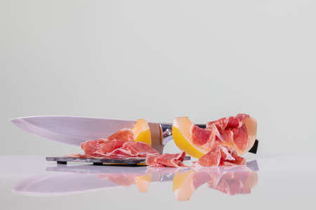 Thin cured ham slices on a dark plate next to a melon slice with cured ham slices on top and a kitchen knife behind on a light background. Tasty food and lifestyle concept.