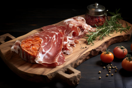 Freshly sliced cured ham with spices floating against a dark backdrop, showcasing gourmet culinary art Perfect for food photography enthusiasts and culinary publications