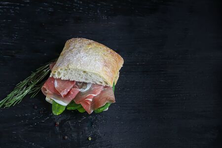 Ciabatta sandwich with arugula salad, spinach leaves, bacon on a wooden board. Next to olives and olive oil and a sprig of rosemary. On a black background. Copy space