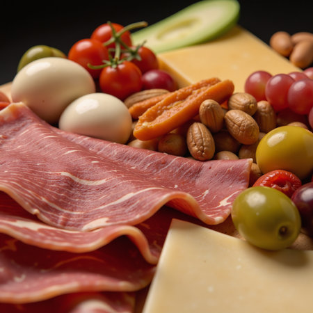 Vibrant charcuterie platter showcasing diverse meats cheeses veggies olives and accouterments