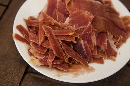 Close-up detail of a serving of 100% acorn-fed Iberian ham