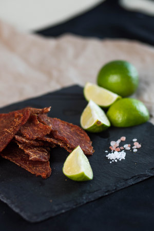 Italian prosciutto crudo or spanish jamon on a dark cutting board with salt and spices