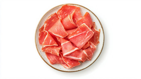 A mesmerizing close-up of delicately sliced dry-cured ham reveals intricate textures and colors, perfect for gourmet culinary presentations and food styling.