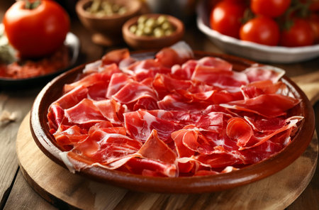 Traditional Spanish Iberian Serrano Ham with tomato. Parma ham Italian antipasto