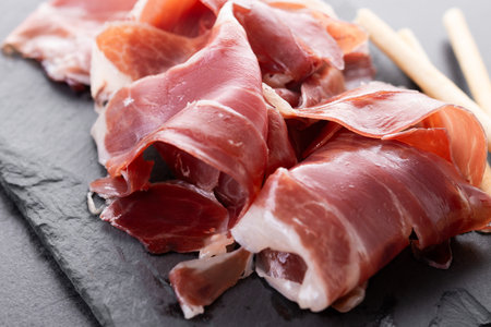 Slices of Spanish Serrano Ham on black slate background