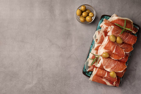 Rolled slices of delicious jamon with rosemary and olives on gray table, flat lay. Space for text