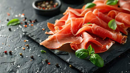Italian prosciutto crudo or jamon on black stone background. AI Generated.