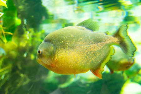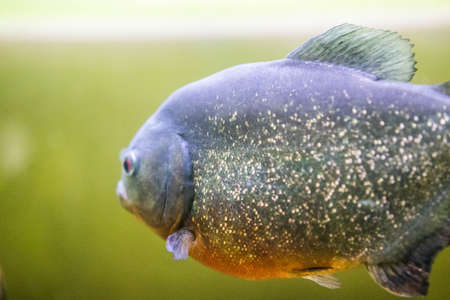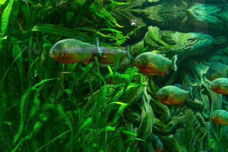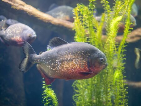 Predatory hungry freshwater red bellied piranha fish swimming in aquarium of oceanarium. Flock of piranhas close-up view.