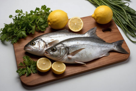 Two fish on a cutting board with lemons and herbs photo of food, festive dish, delicacy. Lemon Breeze: Fish with Greens. Fish Sparklers: Festive Dish.